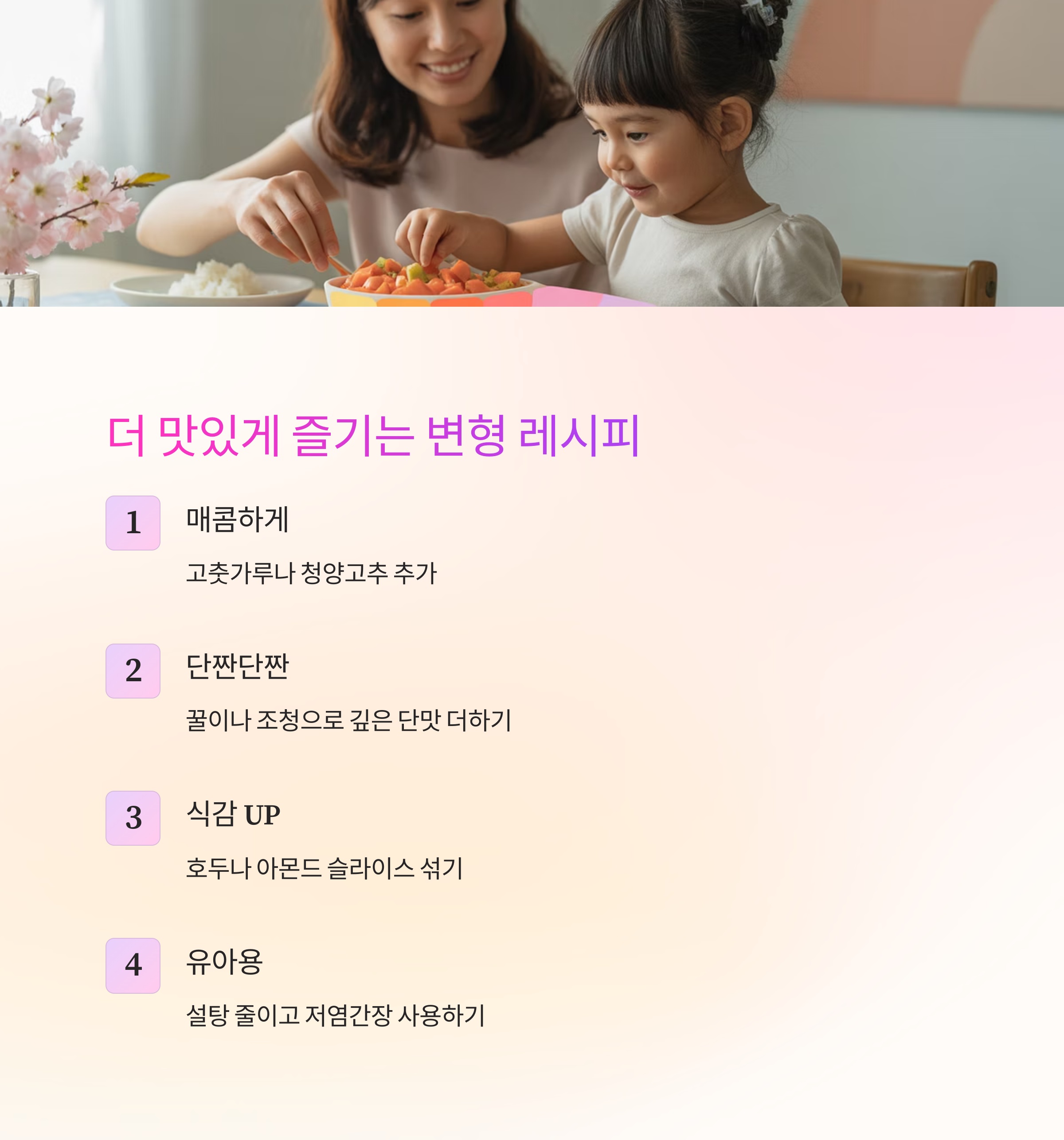 - 유아 반찬용: 설탕은 줄이고, 저염간장이나 채수로 맛을 내면