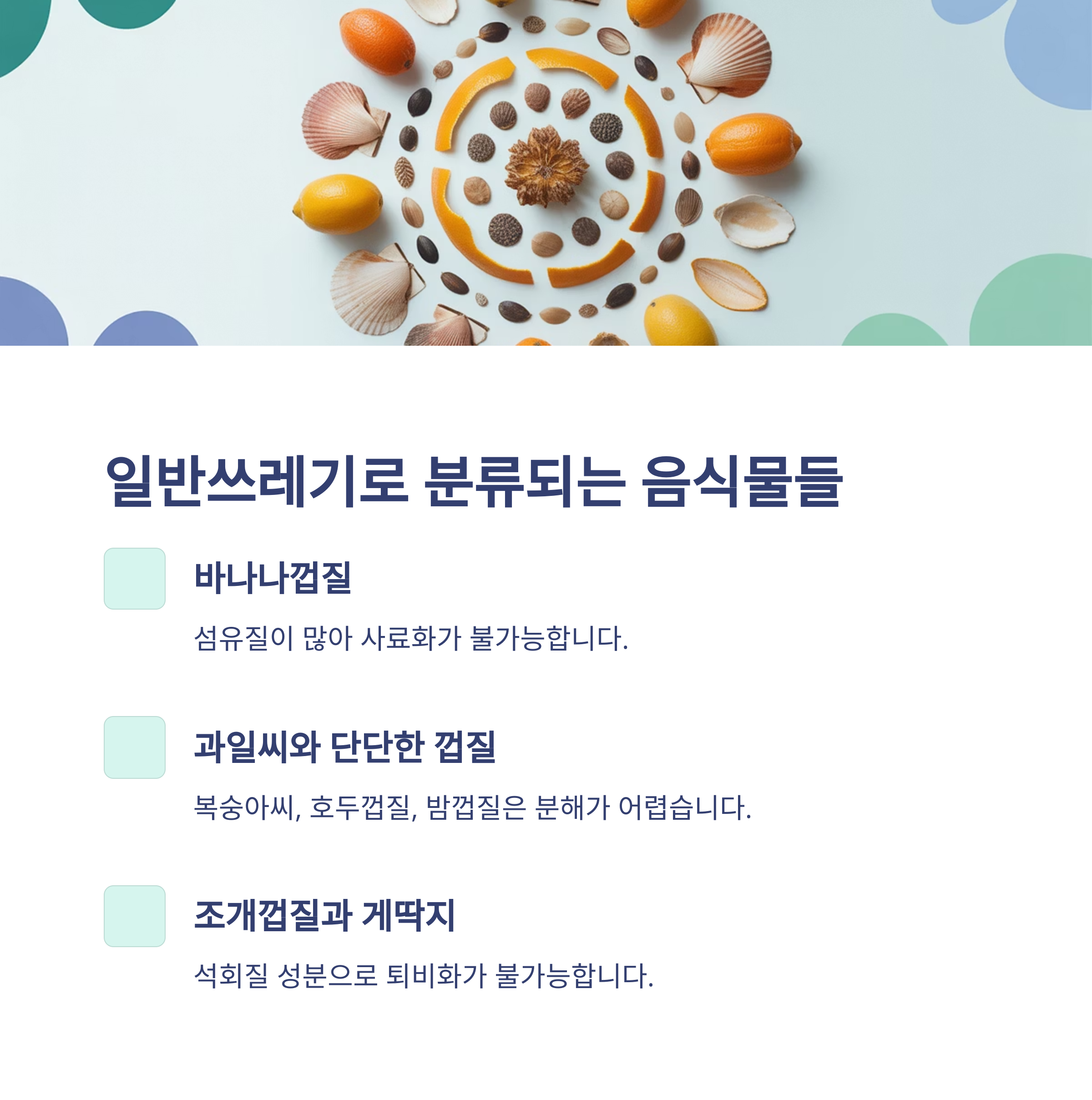 | 조개껍질·게딱지 | 석회질, 퇴비화 불가능 |