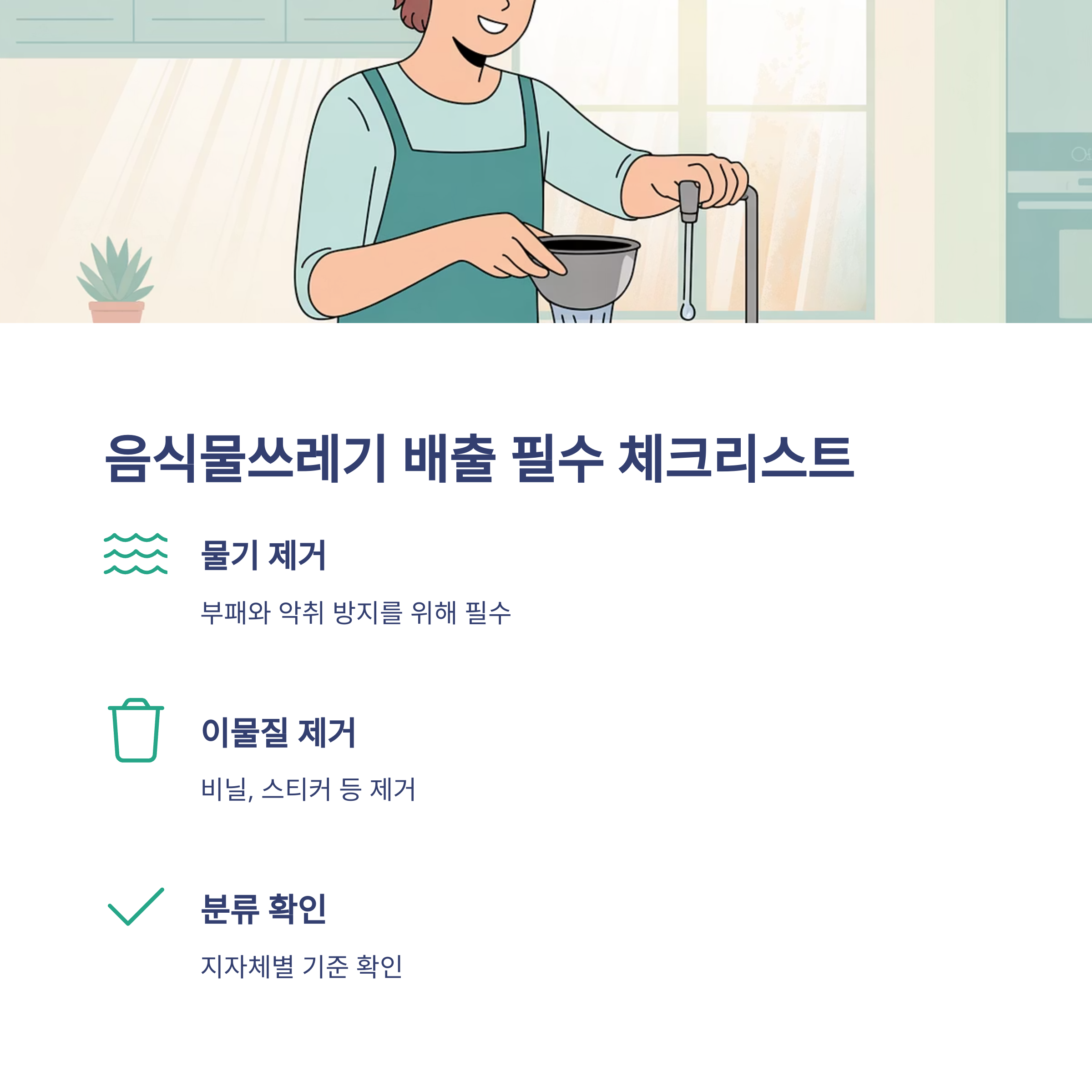 음식물쓰레기 배출 시 반드시 확인해야 할 항목은 다음과 같습니다.
