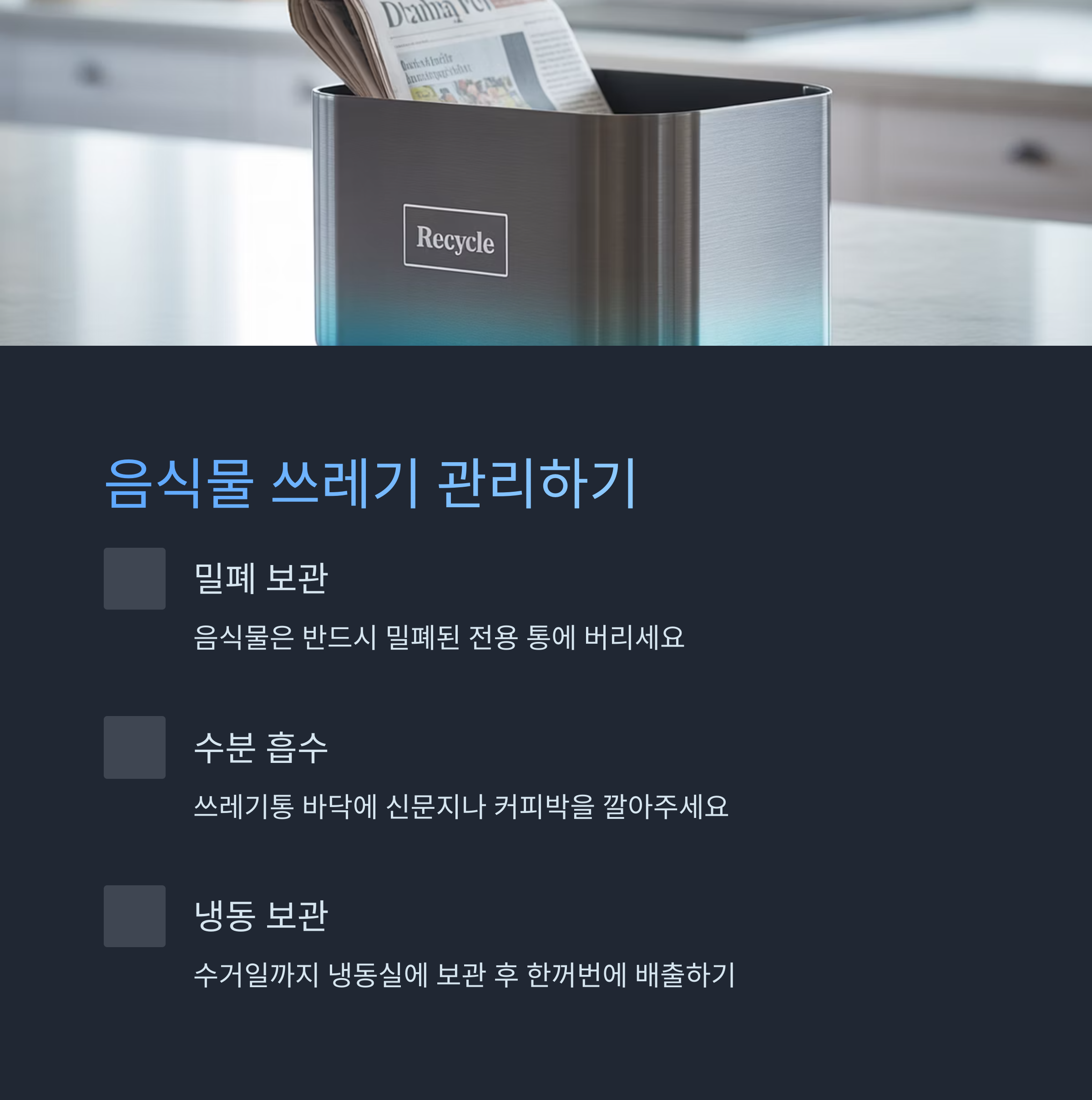- 음식물 쓰레기통 바닥에 신문지 또는 커피박을 깔아 수분 흡수