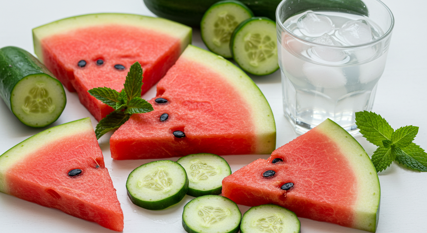 수박은 90% 이상이 수분으로 이루어져 있어 몸의 열을 내리는 데 최고예요. 여기에 소금을 살짝 뿌려 먹으면 땀으로 배출된 전해질을 보충해 주어 탈수 예방에 더욱 효과적입니다. 오이도 훌륭한 파트너죠. 수박과 오이를 갈아 주스로 마시면 시원함과 영양을 동시에 잡을 수 있어요!