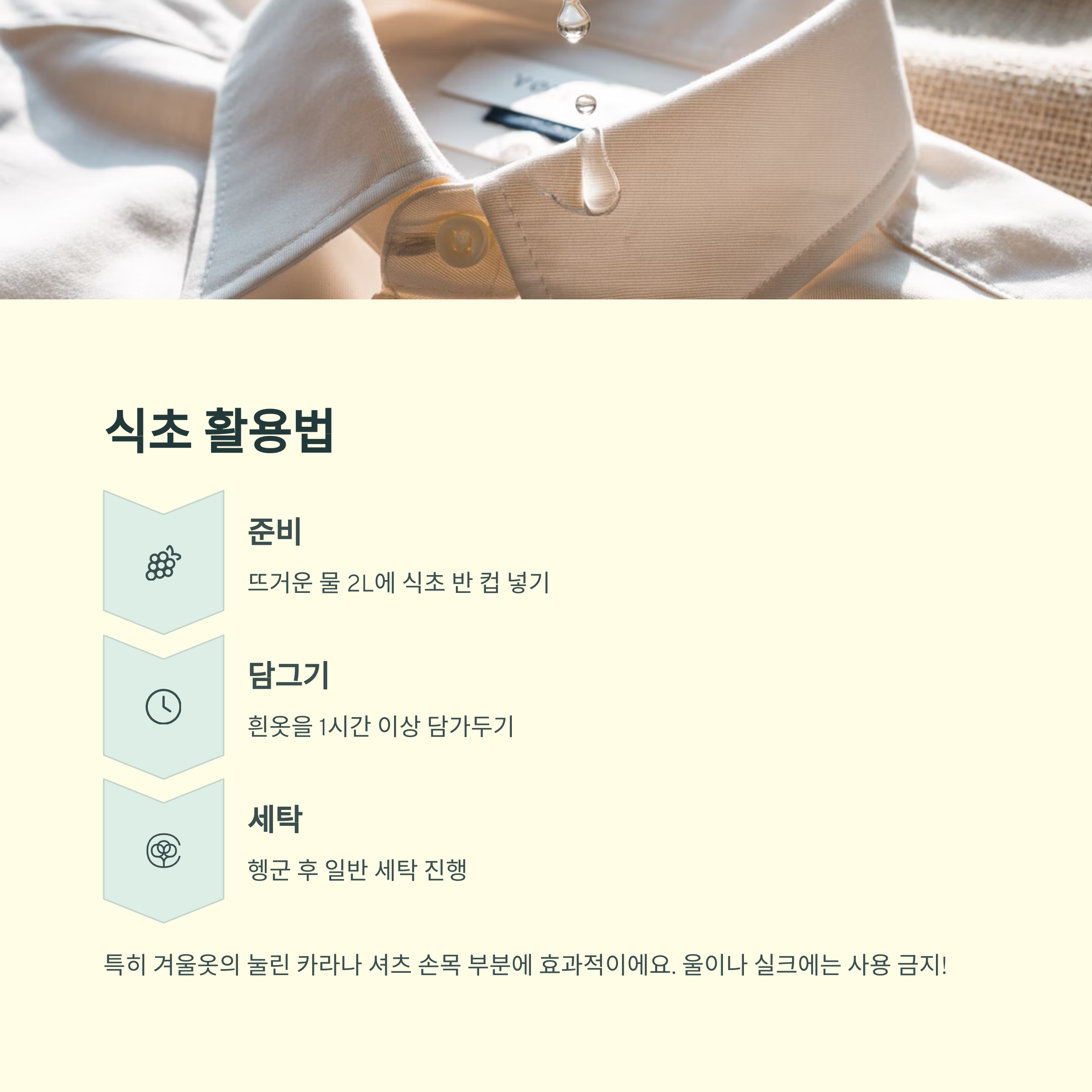 뜨거운 물 2L에 식초 반 컵을 넣고, 흰옷을 1시간 이상 담가보세요.