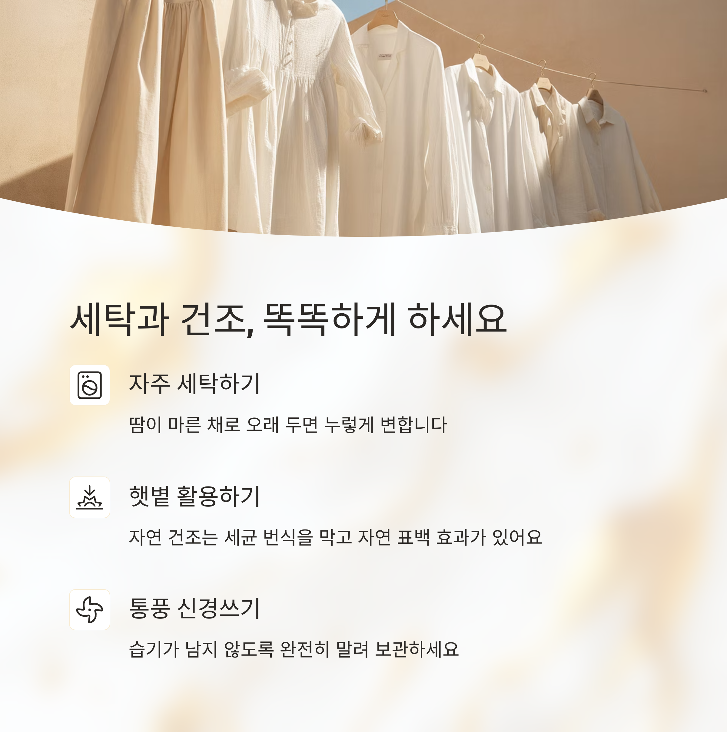 | 땀 제거 후 세탁 | 운동 후나 여름철에는 바로 세탁하는 습관 |